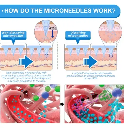Each needle is 0.27mm long, just 1/7th the thickness of a hair, and is made from dissolvable medication. These micro-needles are precision-engineered using cutting-edge manufacturing techniques to ensure a seamless, pain-free experience while effectively delivering the active ingredients directly into the skin.